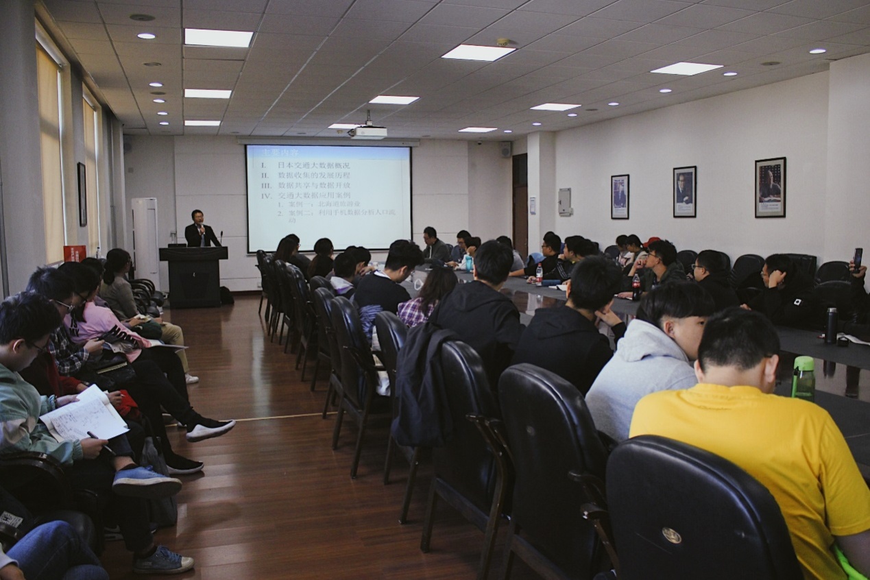 讲座主要介绍了日本交通领域大数据的背景与应用等相关内容。包括交通领域内大数据的种类、收集大数据的背景与发展历程、数据的共享与开放,并结合具体案例介绍大数据在日本的应用,吸引了众多同学参加。