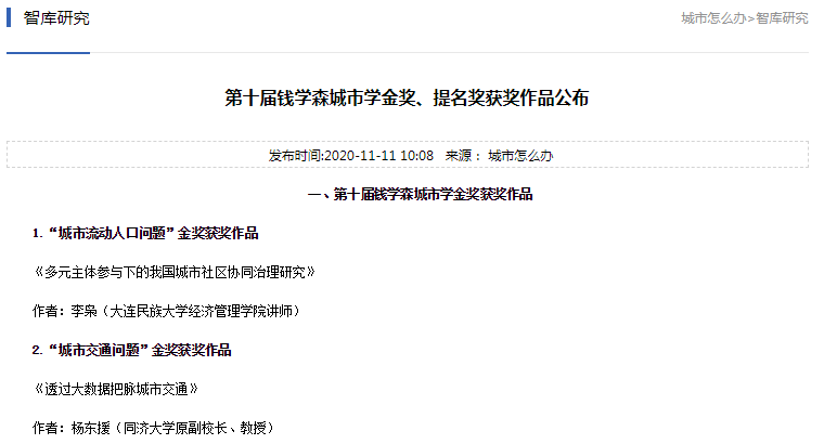 第十届钱学森城市学金奖、西湖城市学金奖征集评选活动共收到“钱奖”作品1490篇(部)、“西奖”点子7246个,每个城市学主题评选出金奖1篇(部)、金奖提名奖10篇(部)。我院姚荣涵副教授提交的《交通流理论》一书从城市交通平台征集的206篇(部)“钱奖”作品中脱颖而出,获得了第十届钱学森城市学“城市交通问题”金奖提名奖。