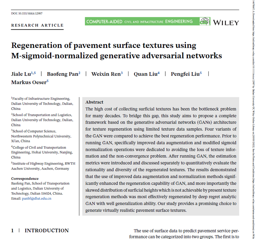 近日,大连理工大学建设工程学部交通运输学院潘宝峰教授及其博士研究生卢佳乐等人与德国亚琛工业大学道路所团队在国际顶级期刊《Computer-Aided Civil and Infrastructure Engineering》上合作发表封面论文:“Regeneration of pavement surface textures using M-sigmoid-normalized generative adversarial networks”。